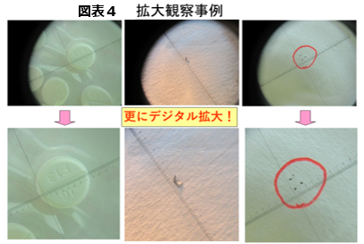 マイクロスコープおよび簡易観察用のスケールルーペとデジタルカメラの組み合わせ使用例について、図表1~4に示す。