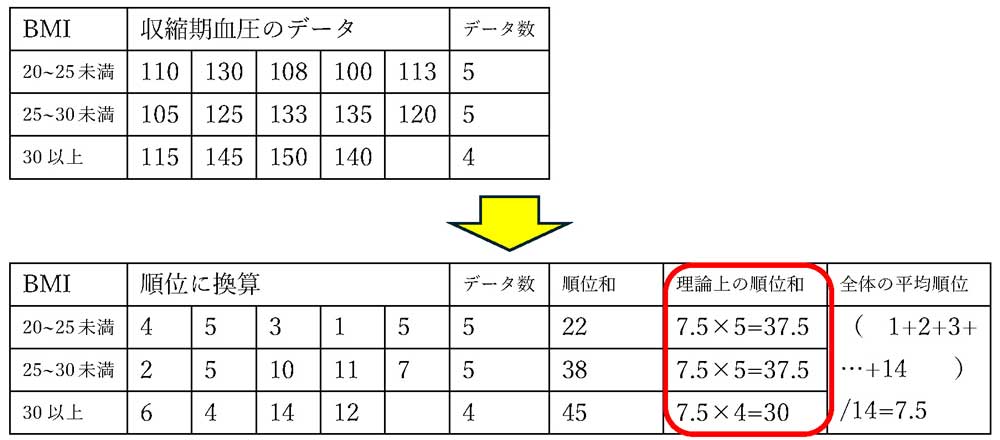 次に各群の順位の輪を求めてみます。BMIが小さい群から、22,38,45となりました。BMIが小さい群の方が順位和がより小さく、特にBMI30以上の群では、45と最も大きいようです。理論上の順位和は、1から14までの合計値の平均は7.5ですので、5人の群は7.5×5で37.5、4人の群は7.5×4で30になります。こうしてみますと、BMI30以上の群は、人数が少ないにも関わらず、順位和は最も大きくなりました。これは何かありそうですねということで理論式にはめてみましょう。