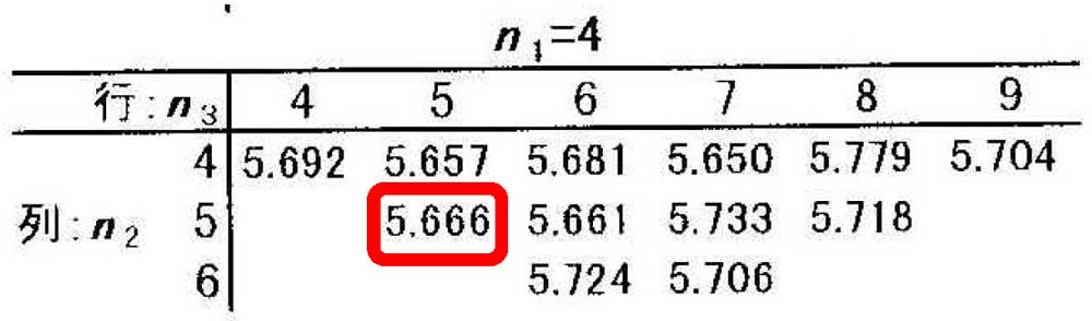 ところで上記の5.666とは?これは、このパターンの時のKruskal-Wallisが有意になる値であり、症例数の組み合わせによって値は異なります。今回の事例では4例と5例、5例の14例になりますので、下記はn1=4(最も小さい症例数が4の場合)のKruskal-Wallis統計量の表になります。n2=5,n3=5の交差する場所にある値に注目願います。検定統計量Hが、この値を超えたときにp<0.05となり、有意と判断されます。正規分布で例えるのであれば1.96、すなわちp値がちょうど0.05になる値、すなわち有意水準点であるということです。