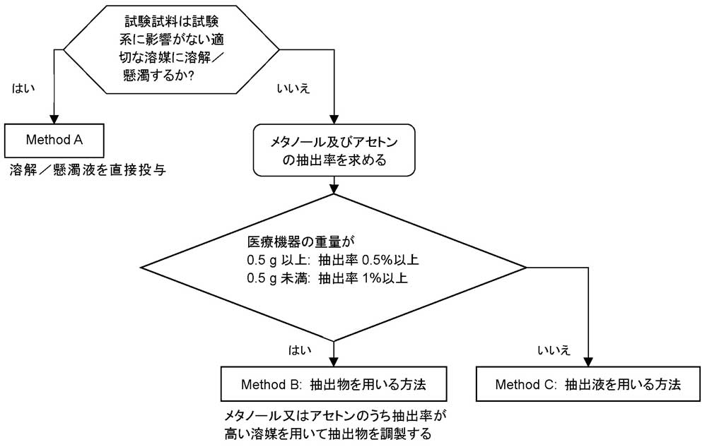 これを見る限り、溶解/懸濁しない材料では、アセトンやメタノールを溶媒とした場合に十分な抽出物が得られるとそれを用いた試験となり、国内ガイダンスと同様でした(Method B)。一方、抽出物が得られない場合は、ISO 10993-12に従って抽出するという方向になります(Method C)。ISO 10993-12は、さまざまな試験の抽出がこのパートにしたがうようになっていますが、本文中に「抽出は、極性及び非極性の抽出溶媒を用いて行わなければならない。」と記されており、ここで感作性と同様に2種類の溶媒で試験を行うような方向になります(実際には、海外のレポートではいきなり2種類の溶媒で実施した試験結果を見ることが多く、抽出率に応じて選択したような書きぶりのものを見たことがありません)。