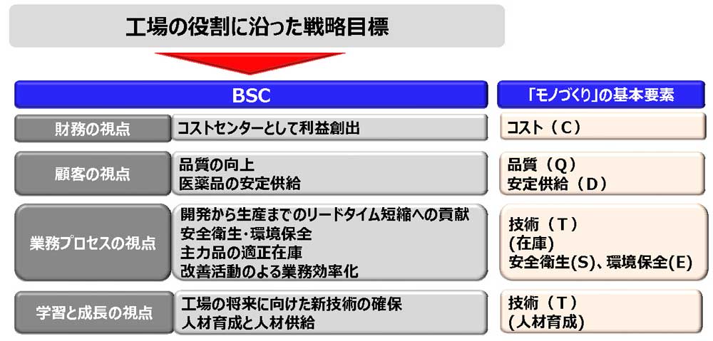第42回連載記事で、工場のBSC例を「モノづくり」の基本要素と関連付けると図1のようになることを紹介しました。例えば、Costを評価するKPIは、財務の視点で工場戦略目標を評価することに繋がり、品質、安定供給は主に顧客の視点での戦略目標の評価に関係していきます。