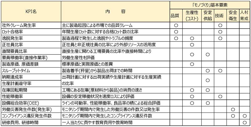では、「モノづくり」の基本要素のパフォーマンスレベルを評価するKPIには、どのようなものがあるか、その代表的なKPIを表1に示します。