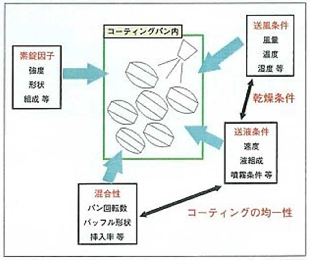 フィルムコーティングの製造条件としては、フィルムコーティングの均一性に加え、コーティング中の乾燥条件に留意し、最適化を図る必要がある。製剤品質に影響を及ぼすフィルムコーティングの製造要因の模式図を図1に示した。