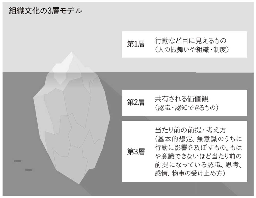組織文化は、海に浮かぶ氷山のように、水面上に第1層が現れますが、水面下に第2、第3の要素が隠れ、内外からも特徴が見えにくくなっています。