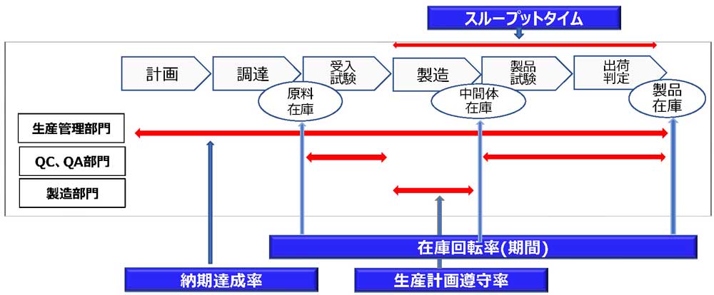 筆者らは、過去に安定供給のKPIとして、欠品発生回数や欠品発生率を検討したことがありましたが、このKPIを設定して評価することは、欠品の発生を肯定することになり、工場が安定供給に取り組む成果を評価するKPIとしてはふさわしくありません。むしろ、安定供給のKPIとしては、製造を担う工場が欠品を発生しないように計画通り所定量を製造し、決められた期日までに出荷することで、適正在庫量を確保していく事が重要になります。ここでは、図1に示したような生産フローに沿って、関連部門の安定供給レベルを評価する納期達成率、生産計画遵守率、スループットタイム、在庫回転期間(在庫回転率)を紹介します。