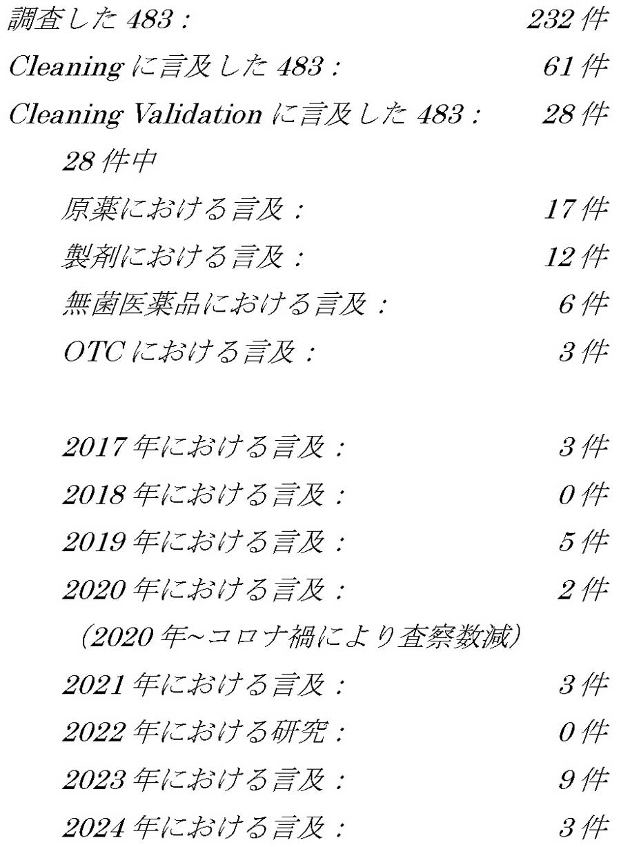FDA OOSガイダンスの抜粋概要連載128回において「国内外のFDA査察において洗浄バリデーション(Cleaning Validation)の指摘が増加しているように感じる」と記載した。筆者が本稿執筆時に所有していたFDA国内査察における232件の483に対し、洗浄バリデーション指摘の確認を行った。医薬品の品質保証において洗浄バリデーションは非常に重要であるので、データインテグリティやCSVの指摘ではないが、その確認結果の概要を以下に紹介する。(詳細は表130-1を参照)
