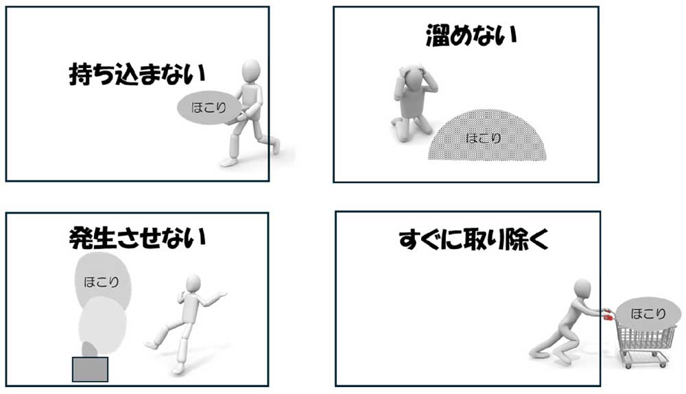 クリーンルームに塵埃を、持ち込まない、発生させない、溜めない、すぐに取り除く。