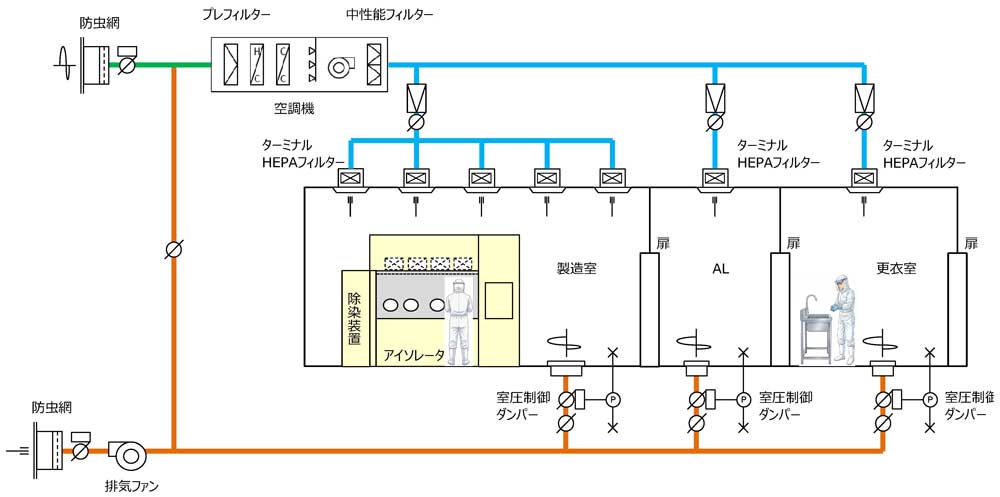 以下、菌に注目して、具体的な装置や施策を挙げるとともに、どのような関係になるのか架空のクリーンルームフロー図を示します。