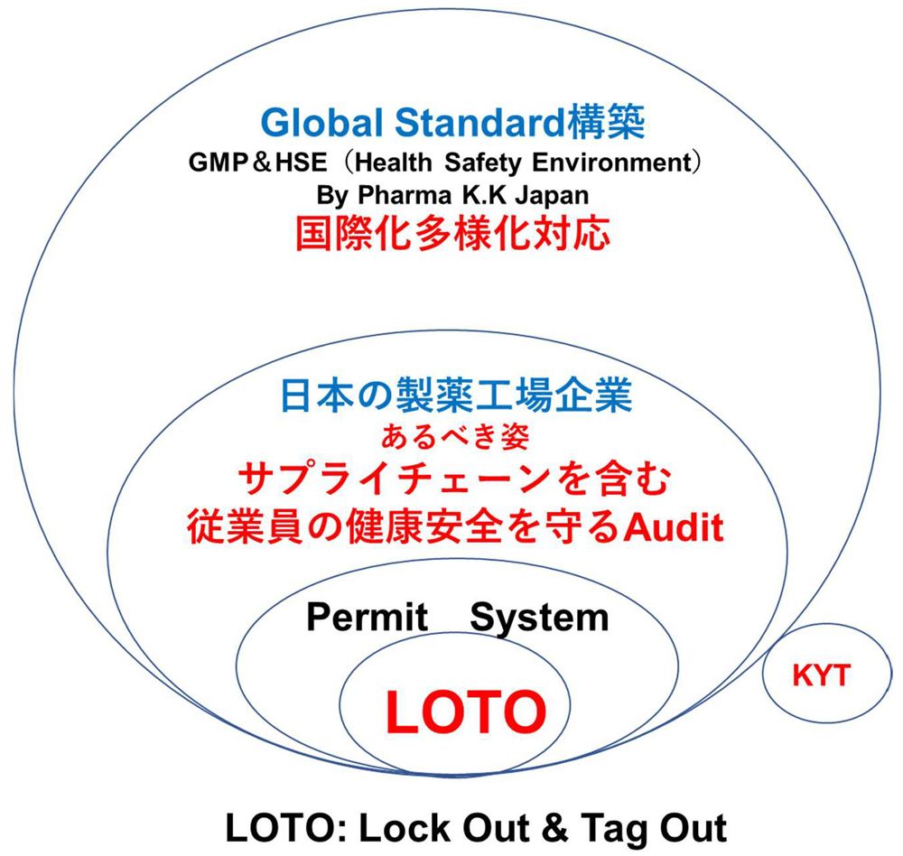 そして、企業や工場の目標「災害0をKYTで達成しよう」という活動も重要ですが、精神面だけでは完全を期すことは出来ません。多くの工場でKYTは職場に定着していて、GMP同様、日常的に作業前TBM(Tool Box Meeting)で今日の作業予定とその作業にどんな危険が潜んでいるかをグループで話し合い、今日の安全重要ポイントを決め、全員で安全唱和し「何々しよう! ヨシ」「0災でいこう! ヨシ」と声を掛け合うことが出来ているものと思います。又、これは毎日の安全意識を高めるために重要です。これは前述したように、安全意識を日々高めることは重要ですが、これだけでは足りないことが近年明らかになってきました。KYTに物理科学的な根拠が見つからない事が問題で、更なる安全作業レベルを求める上で必要であることがわかってきました。一例が、Permit System(安全許可証システム)とその具体的なシステムであるLOTO(Lock and Tag)Systemです。これをリスクアセスメントで優先順位の高い作業を明確にした上で、ハード面とソフト面の対策をPermit SystemとLOTO Systemで施錠と表示を実施する事により、重大リスクの低減を図る手法となります。このようにHSEのグローバルスタンダードで管理されることの重要性が、サプライチェーンも巻き込んで従業員の安全を確保する為に必要である事が求められるようになりました。製薬工場の生産ラインやユーティリティ設備の管理をする上で、これらの運用が図られると、製薬工場のビジネスを継続する上で重要である事があるべき姿と言えるのでしょう。