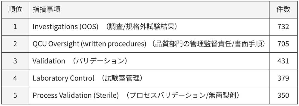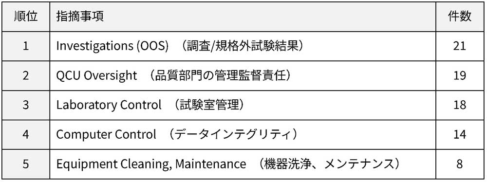 国内企業においても、OOS調査への指摘が最多であるほか、品質管理部門(QCU)の管理監督責任やデータインテグリティに関する指摘が目立つ傾向にあります。