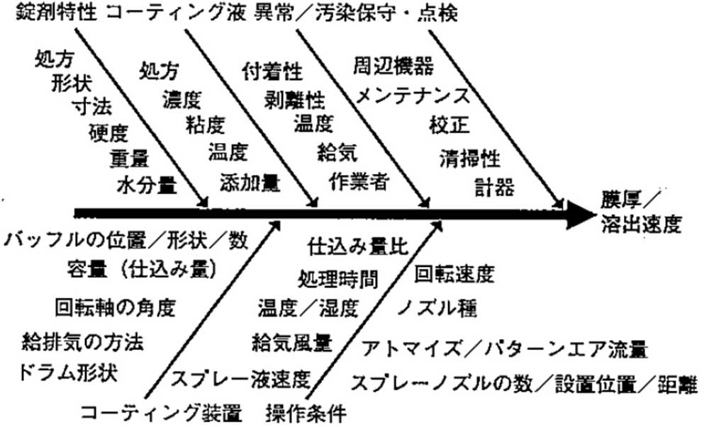 木下ら2)は、品質工学的手法による錠剤コーティングプロセスの機能性評価を行っている。フィルムコーティング(FC)工程における重要な品質は、溶出速度である。皮膜の厚みを制御することで、溶出制御能が制御できると定義している。コーティングにおける特性要因図を図12)に示した。
