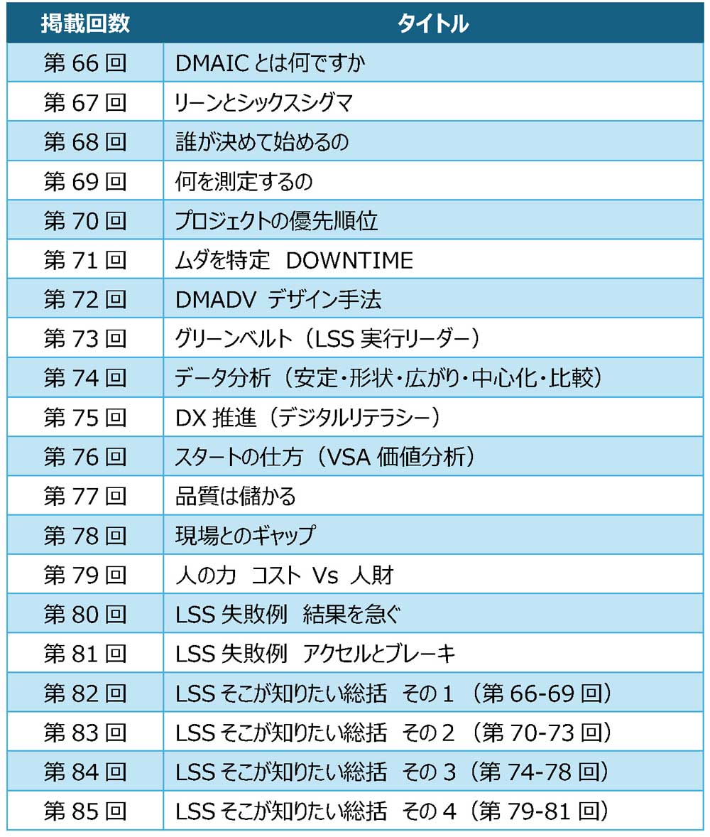 当シリーズのビデオ記事はこれにて完結しますが、文章記事でも振り返りたいとのご希望があり、シリーズのダイジェスト版を文章記事で4回に分けて執筆いたしました。ビデオ記事の振り返りと補足事項を含め文章記事にしました。業務上の問題や課題に関してLSSを活用する勘どころ、どんな解決アプローチが効果的かなど、16回のビデオ記事の総括をお届けします。表1は当シリーズでお伝えしたタイトルです。第80回と第81回は失敗事例も紹介しました。文章記事とともにバックナンバーのビデオ記事もご覧ください。それではラスト4回、よろしくお願いいたします。