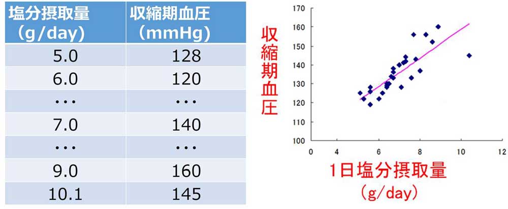 ここまでは「比較」が中心のお話でしたが、今回は少し経路が異なります。医学研究において、「塩分摂取量が多いと血圧が上がるのか?」などといった、2つの変数間の関連性を見たい場面は非常に多くあります。